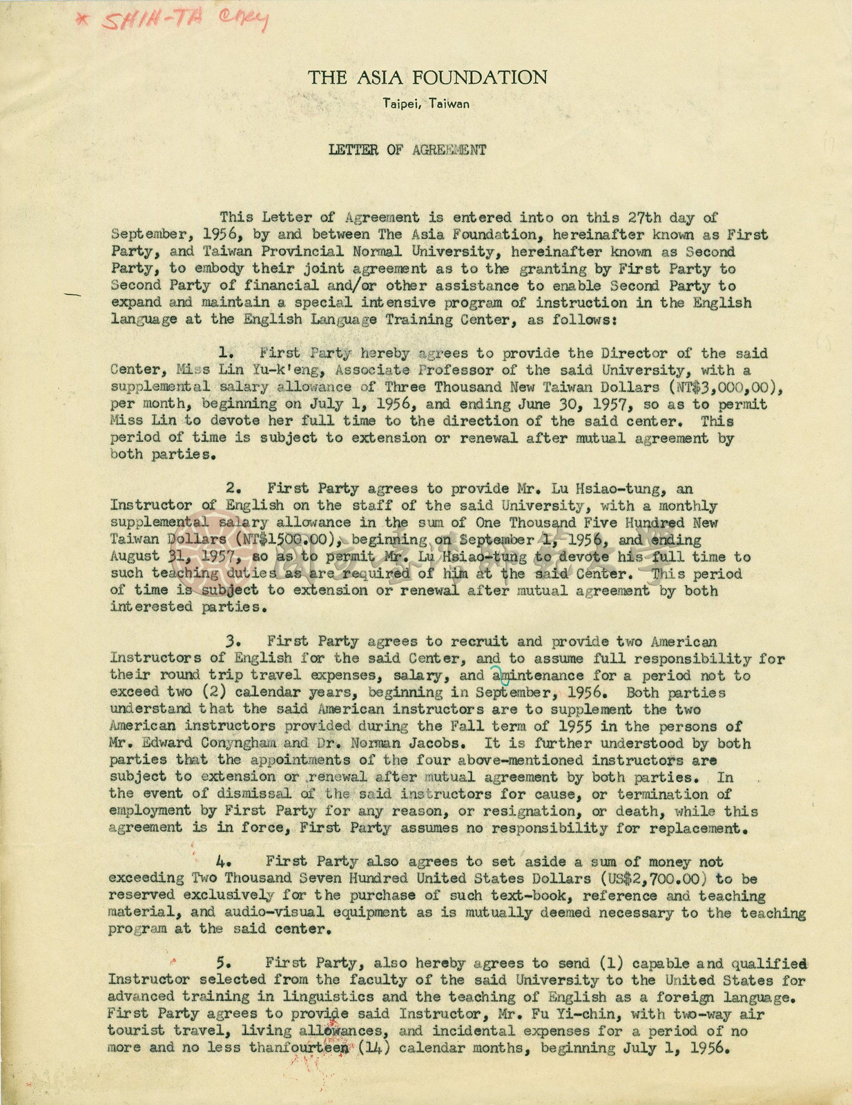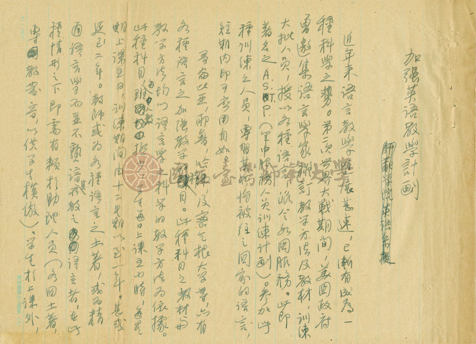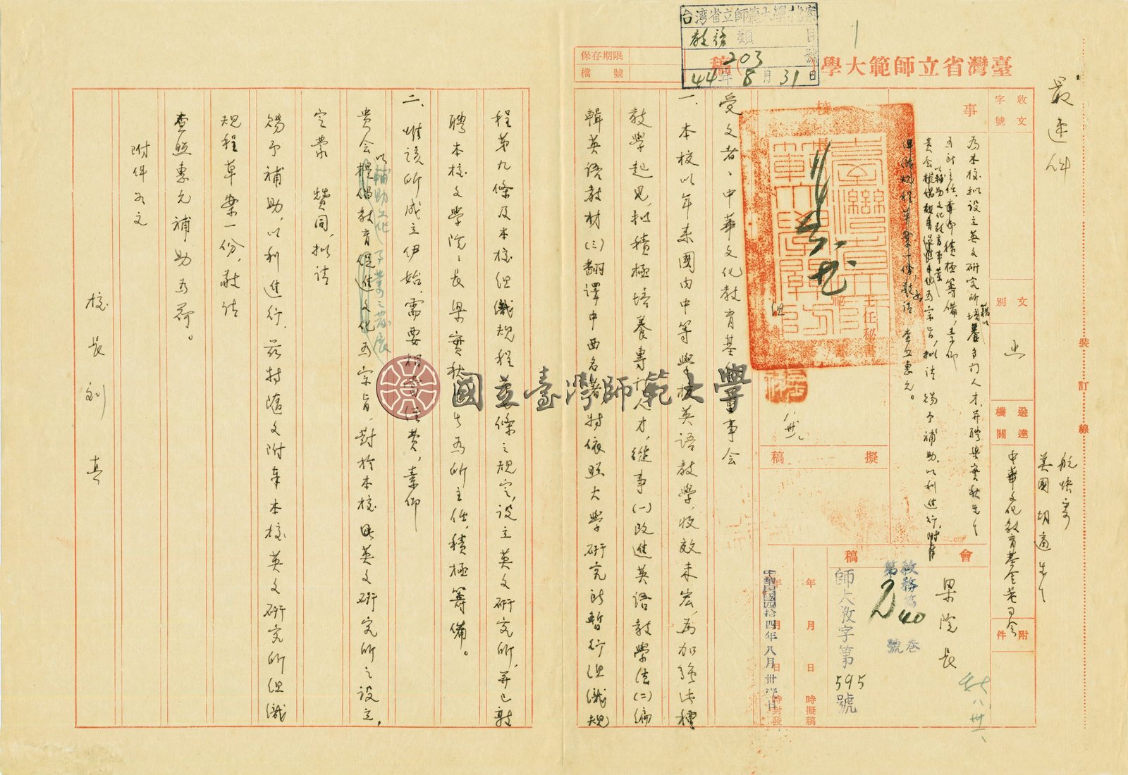 1955年梁實秋致劉真校長的信件,內容提及英語教學方法的改革,並附「加強英語教學計畫」,此計畫促使臺灣省立師範大學與美國亞洲基金會,改進英語教學法,以語言學教學法加強英語系學生之聽、說、寫能力,於1955年秋季設立「英語教學中心」。